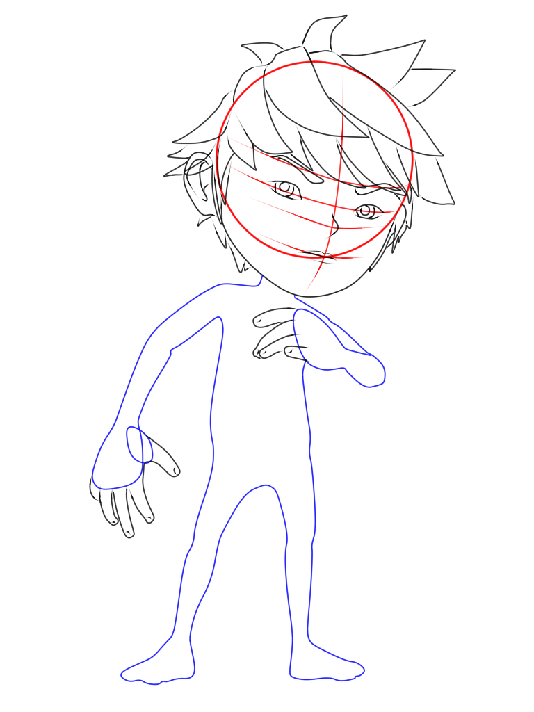 - Setelah selesai dengan bulatan kerangka kepala Fang, lanjut dengan membuat garis bantu. buatlah garis bantu vertikal yang membagi kerangka gambar kepala menjadi dua dan 4 garis bantu horisontal sebagai penentu posisi alis, mata, hidung, dan mulut.
